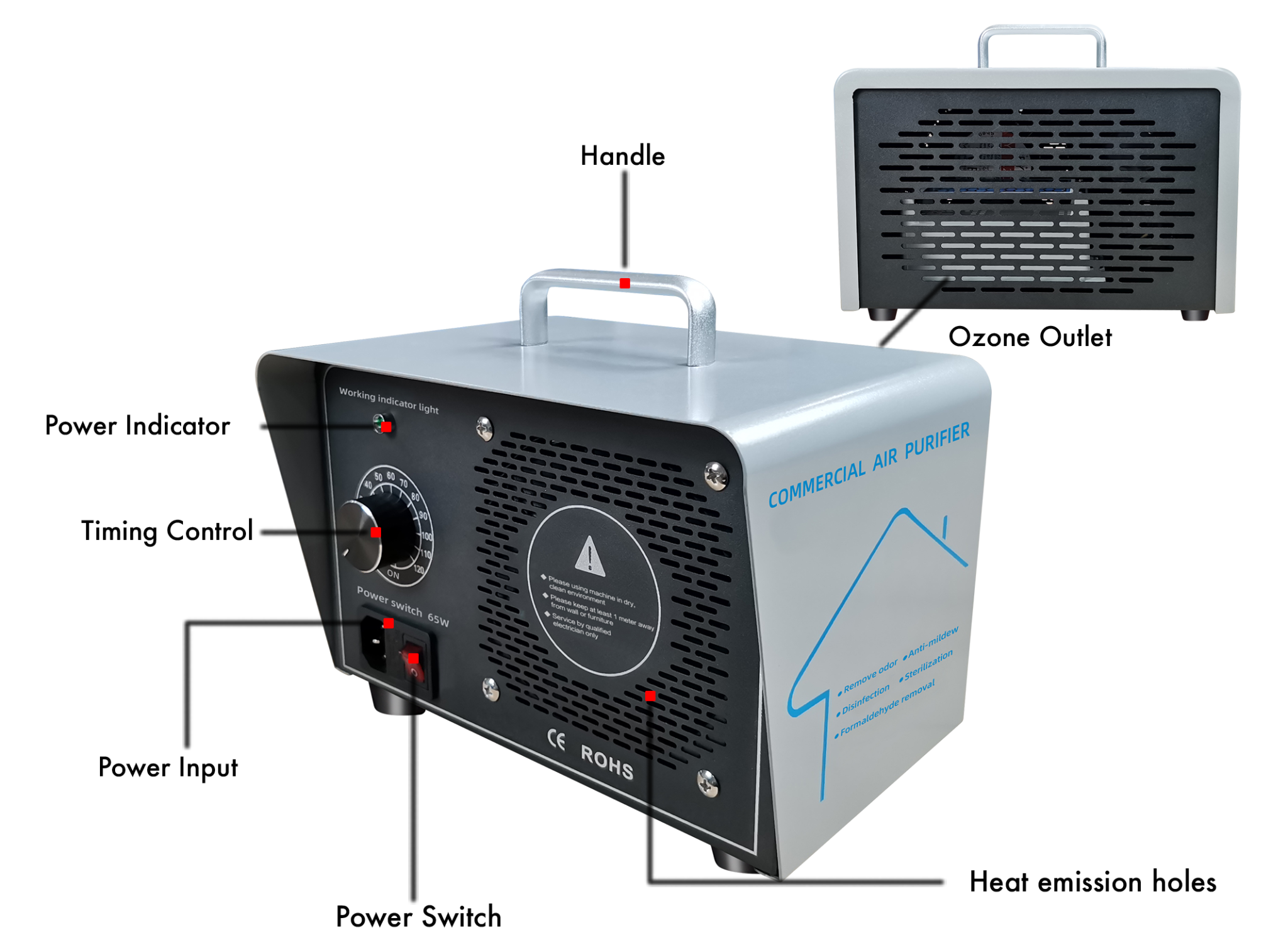 - Ceramic plate discharge: Ensures a long life and stable performance.