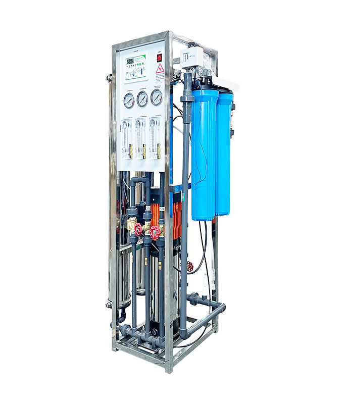 This system includes twin 4040 membranes housed in durable stainless-steel frames. The permeate flush minimizes fouling, while flow meters, pressure gauges, and a micro-computer controller simplify monitoring and operation. Its robust design guarantees long-term reliability in factories, labs, and water-bottling plants.