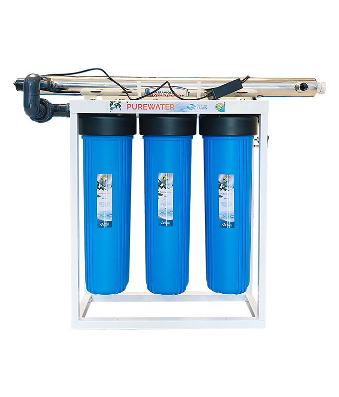 nThe Whole House Water Filtration System is designed with a three-stage water filtration system that consists of 2x 20″ 1 and 5 microns Big Blue Polypropylene Sediment Removal filters, 1x 20″ Big Blue Activated Carbon Block filter, and an ultraviolet disinfection system.